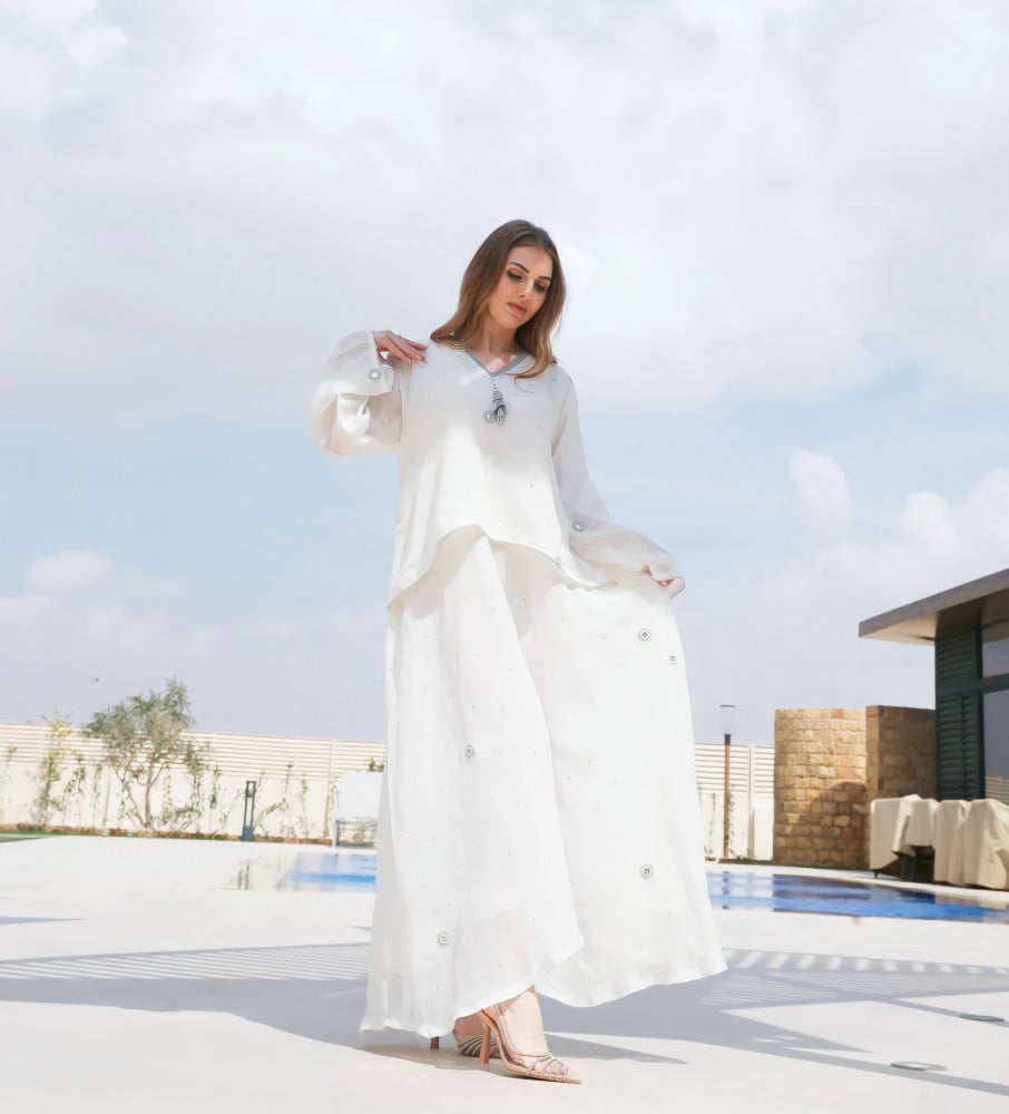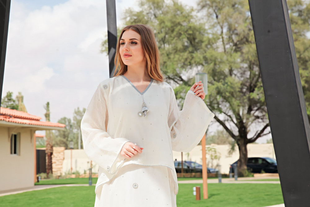 Ladies high neck kaftan with embroidery and sequins on the neck linen