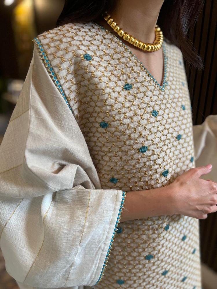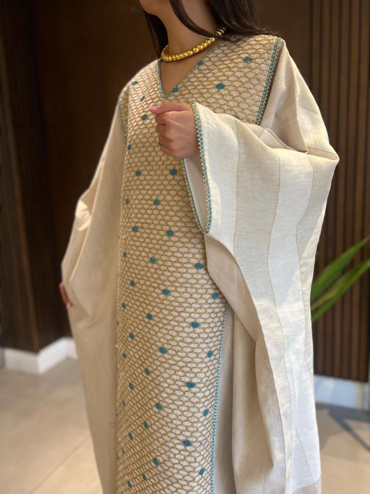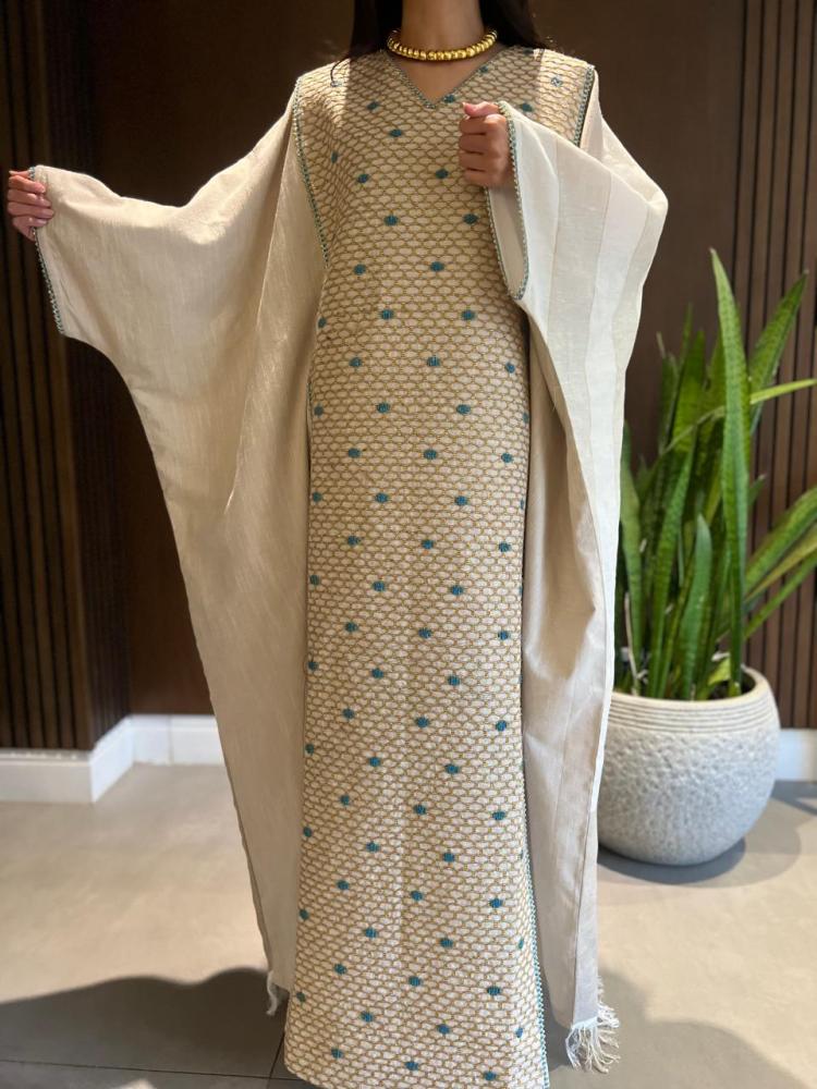 Ladies high neck kaftan with embroidery and sequins on the neck linen