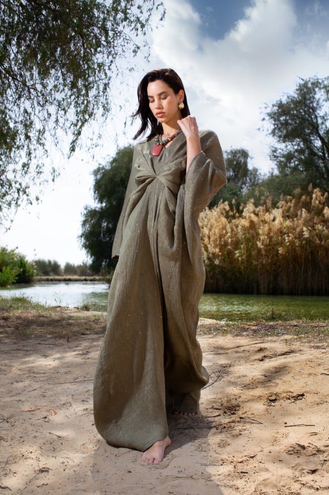 Ladies high neck kaftan with embroidery and sequins on the neck linen