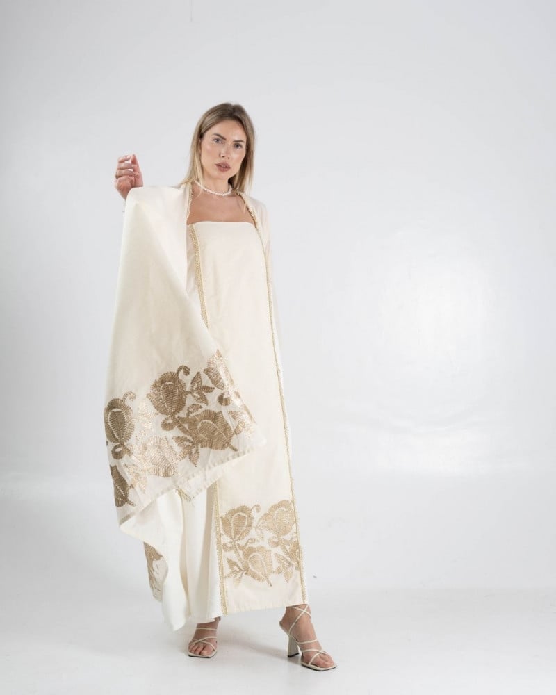 Two piece dress lenin with bottom floral embroidery