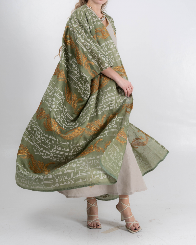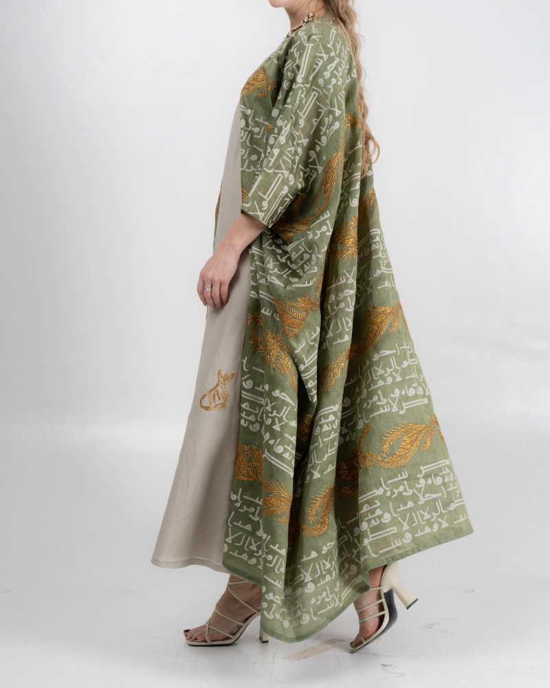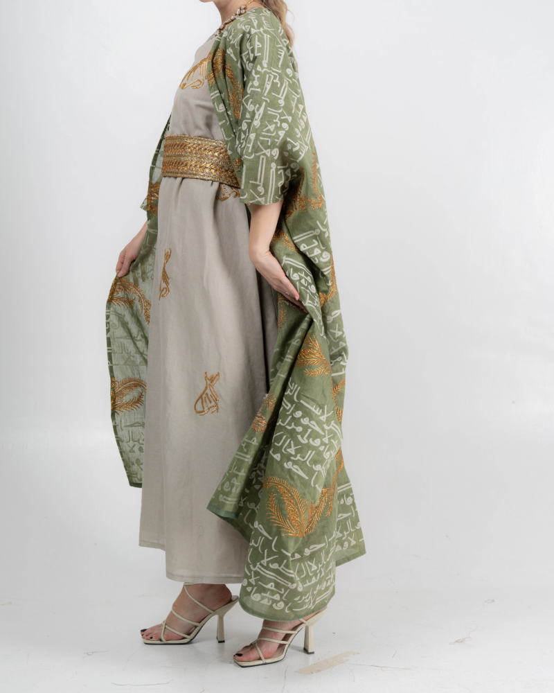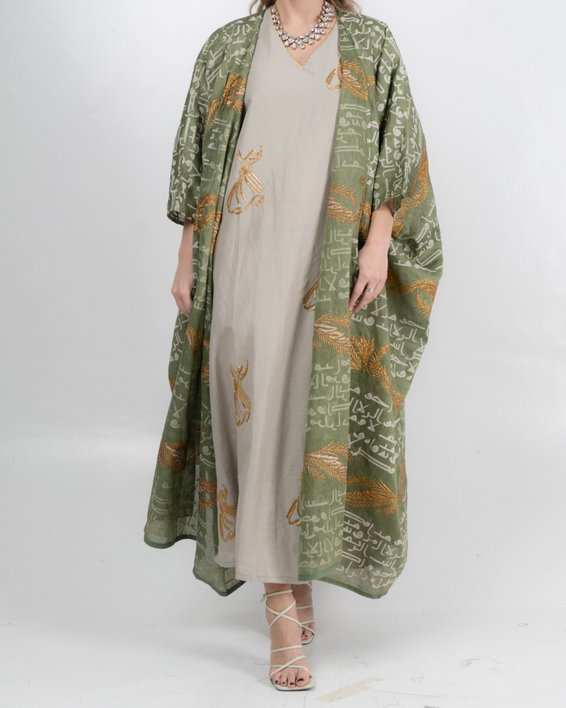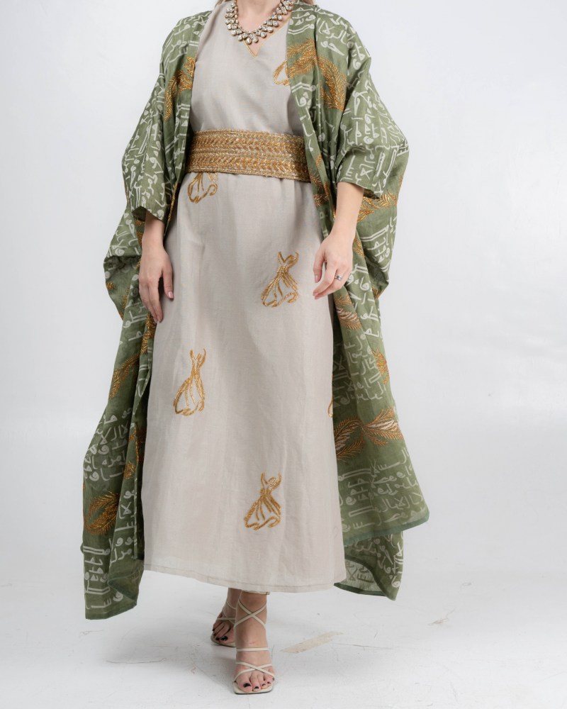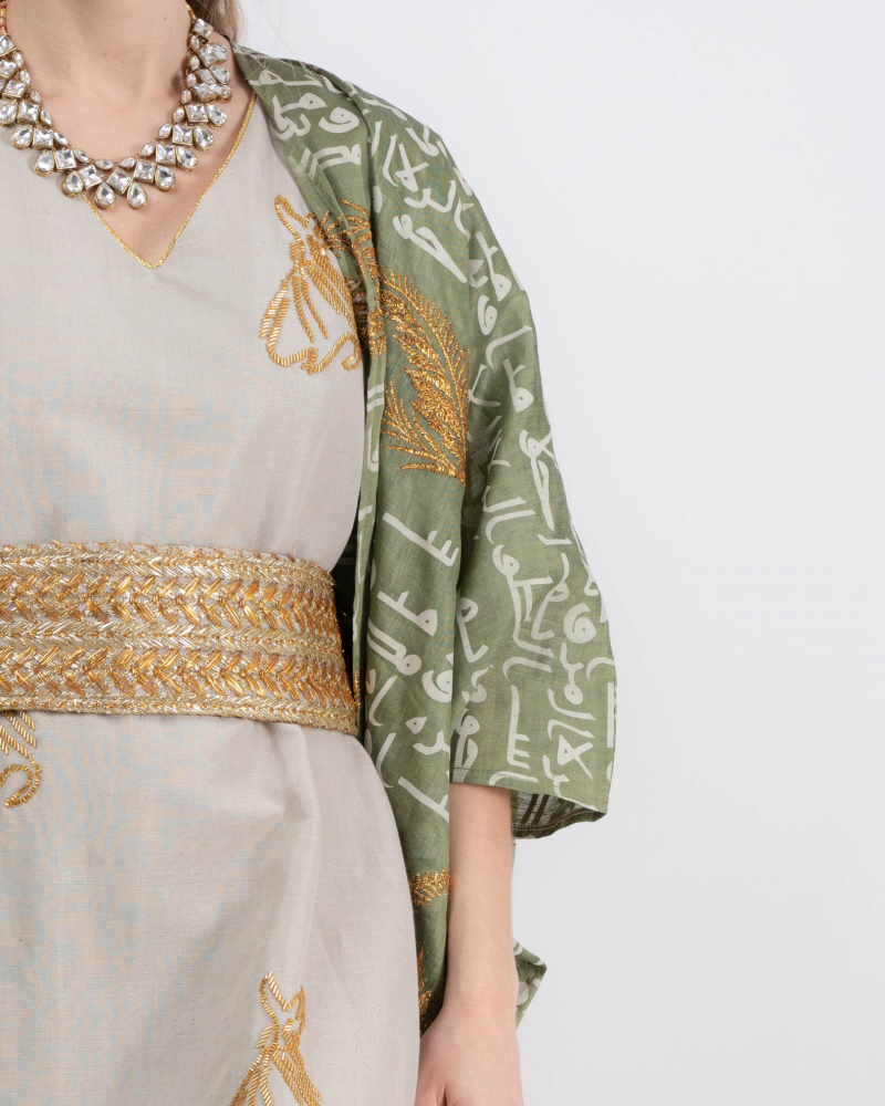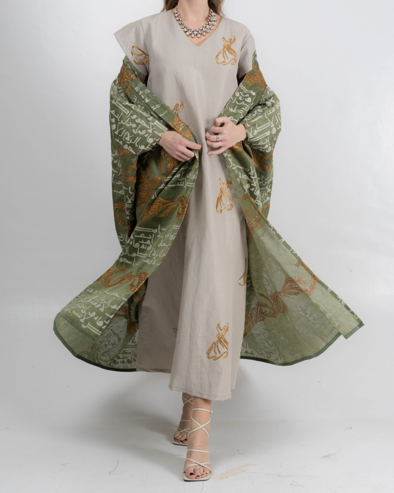 Ladies high neck kaftan with embroidery and sequins on the neck linen