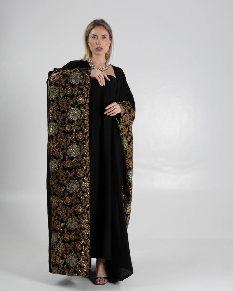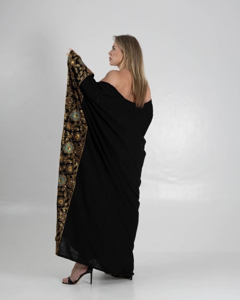 Ladies high neck kaftan with embroidery and sequins on the neck linen